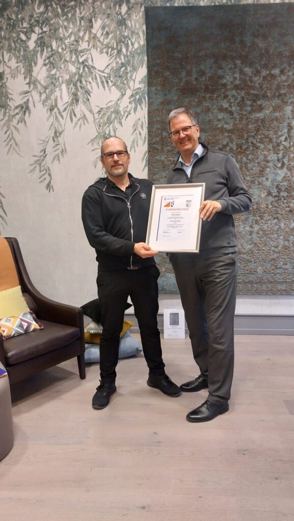 Anlässlich der Jahreshauptversammlung der Raumausstatter- und Sattler-Innung Rheinhessen am 04.12.2025 wurde Herr Stephan Möllers aufgrund seiner Verdienste um die Innung zum Ehrenobermeister gewählt. Wir gratulieren ganz herzlich und möchten auf diesem Weg nochmals für das Engagement von Herrn Möllers danken. Die Ehrenurkunde wurde von Herrn Daniel Becker, stellv. Obermeister der Innung, übergeben.